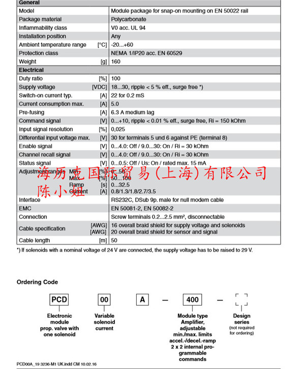 Parker派克比例阀电子模块PCD00A-400-30订货代码: