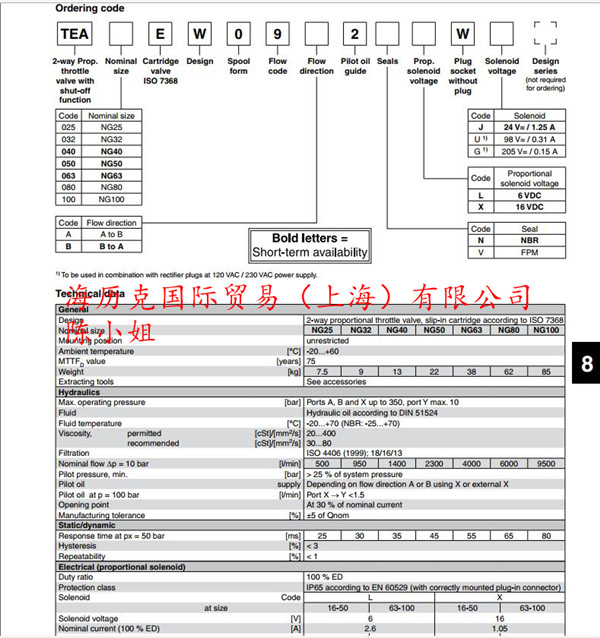 Parker派克比例节流阀TEA080EW09B2NLWJ订货代码: